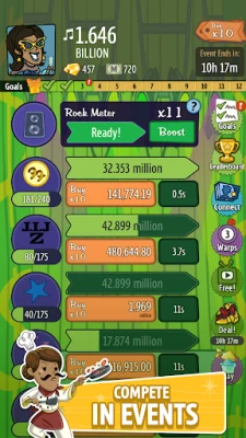 Kai jūsų imperija įsitvirtins Žemėje, metas žengti į kosmosą! Atrakinkite „AdVenture" ekspedicijas į Mėnulį ir Marsą, kur atrasite naujas investicijas, patobulinimus ir vadybininkus, praplėsdami savo galimybes iki tolimiausių galaktikos kampelių. Dalyvaukite reguliariai vykstančiuose riboto laiko renginiuose, pavyzdžiui, „Viso Blogio Šaknis", „Šeštadienio Ryto Karštinė" ar „Gyvenk Turtingai ir Pelningai", kuriuose galėsite pelnyti išskirtinių apdovanojimų, kopti lyderių lentelėmis ir rinkti unikalius vadybininkus, padėsiančius jums tapti oktilijonieriumi. O norėdami pagreitinti savo progresą ir aplenkti konkurentus, apsilankykite parduotuvėje, kur rasite aukso, laiko pagreitinimų ir specializuotų vadybininkų, reikalingų jūsų didžiulei imperijai statyti. Jūsų didysis gyvenimo „AdVenture" prasideda jau šiandien!